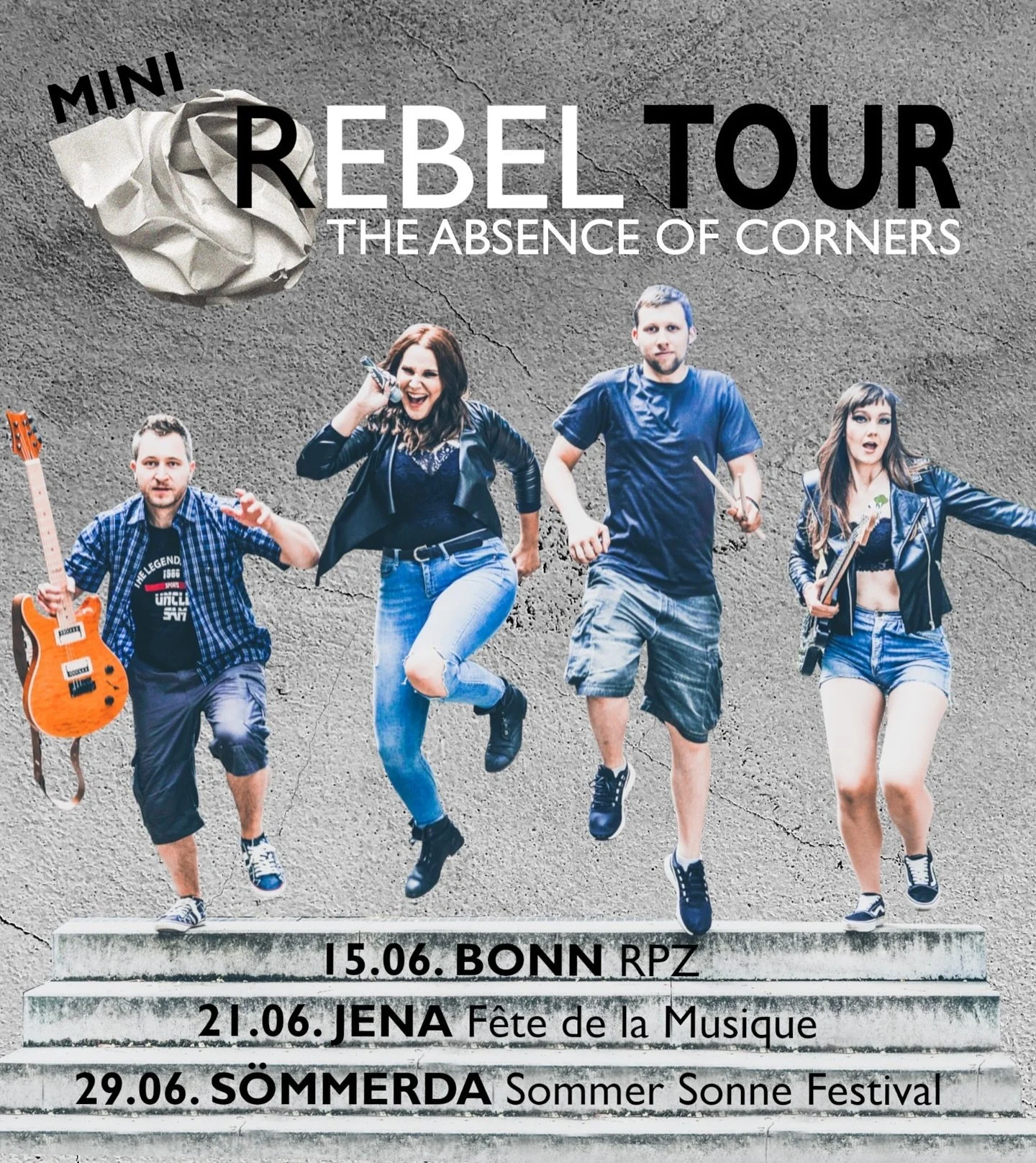 THE ABSENCE OF CORNERS sind eine Jenaer Alternative-Rock-Band mit bunt gemischter Besetzung und einem modernen, abwechslungsreichen Song-Repertoire - ob sich Ecken und Kanten abzeichnen, darf das Publikum gern selbst entscheiden. Stilistisch werden auch Elemente aus Ska, Reggea, Soul, Rap und Metal beigemischt. Untermauert mit starkem weiblichem Gesang erinnern sie einmal mehr an Bands wie Paramore oder die Guano Apes. Mit selbst geschriebenen Songs hält sie nichts mehr auf die großen Bühnen Deutschlands auf.